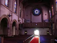 UNMC is an example of Romanesque Revival architecture and was designed by Allen & Collens, architects of the Riverside Church in New York City.[2][5] The four-story building, a contributing property to the Sixteenth Street Historic District, features a stained-glass window and a stone tower that reaches a height of 98 feet (30 m).[1][6]