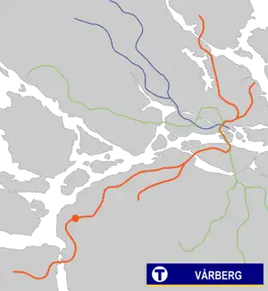 Vårberg is a station in the Stockholm metro in the neighbourhood Vårberg in Söderort, Stockholm Municipality. The station was opened on 2 December 1967 as the south terminus of an extension from Skärholmen. On 1 October 1972, the line was extended to Fittja.[2] Vårberg is part of Line 13 of the Red Line. The distance to Slussen is 12.6 km (7.8 mi).