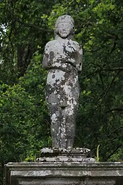 The Vénus de Quinipily (French pronunciation: [venys də kinipili], Breton: Ar groareg Houarn/Groah Hoart, English: The Iron Lady) is an ancient statue of uncertain origins, located southeast of Baud, Morbihan, Brittany, in north–western France. It is approximately 2.2 metres (7.2 ft) in height and carved from granite. The statue represents a naked woman and stands in front of a fountain on a 2.75 m high granite pedestal. The large basin beneath the statue is also carved out of a single granite block. It is believed that the statue may be of Greek, Roman or Egyptian origin. There is similar uncertainty about its subject; it may be a Celtic deity, the Roman Mother goddess Cybele, or an Egyptian Isis statue.