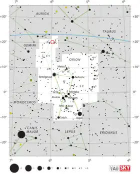 V529 Orionis, also known as Nova Orionis 1678, is a variable star which is usually classified as a nova. It was discovered on 28 March 1678 by Johannes Hevelius, who spotted it while observing a lunar occultation of χ1 Orionis, the star that forms the northernmost tip of Orion's club. Following the occultation of χ1 Orionis, Hevelius observed the occultation of another star by the Moon a few minutes later, which disappeared behind the first quarter Moon at 09:16 and reappeared at 10:29. Those details, combined with modern coordinates for χ1 Orionis, allowed Ashworth to derive coordinates, probably accurate to within a few arc seconds, for the 1678 nova.[3][4]