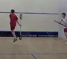 - V4 is also played on a squash court and is played 2v2 with four balls. A game lasts for two halves of four minutes each.[12]