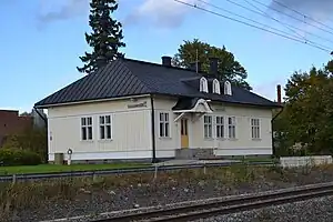 The station building and warehouse were built between 1914 and 1918, and were designed by architect Thure Hellström.[9] The station building was renovated in 1962.[10] In addition to the ticket office and waiting rooms, the station building once housed the stationmaster's apartment. The building has since alternated between being vacant and occupied. It has also served as the premises of the Jyväskylä Rail Club[11] and an antique shop.[12] Since 2008, the station has been home to a ceramics workshop[11] and in the autumn of 2011, six craftspeople opened a shop called Resiina.[13] Today, the station building houses a bathroom furniture shop and renovation company.[14]