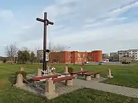 Catholic wooden cross and multi-storey residential housing of Valčiūnai in the distance