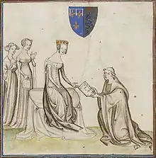 ![]() Valentina Visconti receiving Honoré Bonet's Apparicion maistre Jehan de Meun, c. 1398. Illumination on parchment, BnF | |
