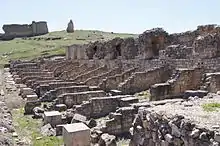 The Basilica is located to the north side of the forum while on the west side are the Exedra (Hall of the imperial cult) and Cryptoporticus, a vaulted underground gallery functioning as a street or storerooms that also served as foundation to the floor of the Exedra and which occupies the whole side of the platform from the Basilica to the southern limit of the Forum. To the south lies a monumental staircase to the forum, a series of shops and the most iconic building of Valeria, the Nymphaeum, over 100 metres long. The ensemble is bounded by streets. The extent and status of the remains indicate that it was a Municipium.