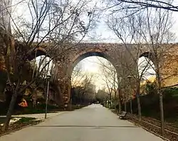 Further south, when the two torrents have already joined, is the longest bridge in the park: the Pont del Passeig. It is a bridge that connects the Vallparadís and the Cementerio Viejo neighborhoods. The construction of this bridge, in 1895, was the first intervention of the Public Improvement Plan of the City Council to divert the northern exit of Terrassa. It is 112 m long by 16.13 m high and is formed by six arches supported by frustum pilasters of ashlars with stone string courses. The entire intrados is made of brick and at the back there is a roadway for vehicles arranged in four lanes, as well as a sidewalk on each of the two sides. The bridge has undergone two extensions in 1960 and 1990 and is currently protected as a Bien Cultural de Interés Local.[30]