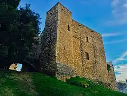 The building rises on the edge of a large embankment of the park and has a rectangular plan, walls with arrowslits, towers at each of its corners and three bestorres on its west side.[note 4] The reforms to transform it to the charterhouse functions still remain. It is worth mentioning a two-story cloister —the lower one with chaotic openings and the upper one more stable with pointed arches— and geometric capitals without decoration with the ancestral chapter house on the east side, covered with a rib vault.[21] The old church of the monastery is what is known today as El Tinellet, with a flat roof supported by four diaphragmatic pointed arches.[21]
