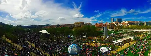 In the month of May, the so-called Holi festival or festival of colors is celebrated in the park. It is a party of Hindu origin that is celebrated to honor the arrival of spring and consists of throwing large amounts of powdered pigments of different colors into the air so that, when falling, it mixes and permeates among all participants.[56] It is an activity with Hindu religious roots, which has been appropriated by the West over time and in which, according to tradition, each person can release, forgive and forget the mistakes made in the past, as well as pay or forgive debts and reinitiate contact with people.[56] The event is attended by thousands of people every year and is organized by members of the Terrassasamba impact group.[57]