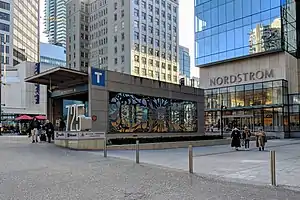 Vancouver City Centre is an underground station on the Canada Line of Metro Vancouver's SkyTrain rapid transit system. The station is located on Granville Street, between West Georgia Street and Robson Street in Downtown Vancouver, and serves the shopping and entertainment districts along Granville and Robson streets, and the office and shopping complexes of Pacific Centre and Vancouver Centre.