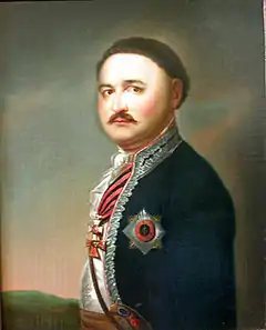 Vasily Petrovich Orlov (Russian: Василий Петрович Орлов), was a Russian Full General of Cavalry. Hero of Russo-Turkish Wars of (1768–1774) and (1787–1792). Ataman of the Don Cossacks, received orders to command the Indian March of Paul in January 1801 from Emperor Paul I of Russia. His wife Daria Fedorovna, was a daughter of Ataman Count Fedor Petrovich Denisov and son of Vasily Petrovich Vasily Orlov-Denisov, a Don Cossacks General in honour of his grandfather Fedor Petrovich Denisov added his surname to his own, becoming count Orlov-Denisov on 26 April 1801.[1]