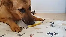 As in the human practice of veganism, vegan dog foods are those formulated with the exclusion of ingredients that contain or were processed with any part of an animal, or any animal byproduct.[1] Vegan dog food may incorporate the use of fruits, vegetables, cereals, legumes including soya, nuts, vegetable oils, as well as any other non-animal based foods.[2]