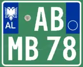 A new format similar to the post-1994 Italian and post-2009 French plate designs has been introduced since 16 February 2011.[1] The plates start with a blue strip at the left with 'AL' and redesigned double-headed eagle in white, 2 serial letters, security hologram, 3 digits, 2 serial letters on a rectangular white background, and end on the right with a blue strip that's supposed to show year of registration and regional code in white on. It has been observed that the last two identification elements are de facto not included while the font is more emphasized than the post-2002 one.[2] Plates of all vehicles would experience a similar change.[3] Critics claim that the color of the double headed eagle and strip is not representative of red and black colors of the Albanian flag.