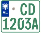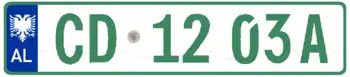 Diplomatic corps vehicle registration plates in Albania have green borders and green texts on a white background. They do not have the blue strip on the right hand-side of the plate, unlike private vehicle registration plates. They follow the format [CD 00 00A], where CD stands for Corps Diplomatique. The first 2 digits of the license plate refer to the Diplomatic license plate codes (explained later in the article). For example code 01 belongs to the diplomatic corps of Austria whereas code 41 refers to the diplomatic corps of the European Union. Plate 01A belongs to the highest-ranking member of staff (usually the Ambassador) whereas all other plates are issued sequentially.