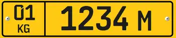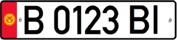 The license plates have the format ## - ### xxx, where the first two digits are province codes. The plate is black on white. Right under the province codes, there is the Kyrgyz flag and the code KG.