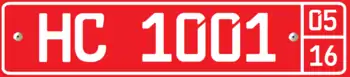 Honorary Consulate plates are white on red, and have the format HC ####, where the four digit number is the country code. On the right end, the date of the issuance of the plate is posted, with the month on the top, and the year on the bottom.