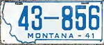 1941 | Embossed blue serial on white plate with state-shaped border; "MONTANA–41" below serial | none | 1-12345 10-1234 |