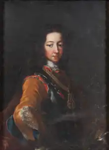 From birth he was styled as the Prince of Piedmont, the typical style for the heir apparent to the Duke of Savoy.[3] Victor Amadeus was born at a time when the House of Savoy was in need of a male heir to succeed as the duchy observed Salic law which forbade females to inherit the throne. His birth was greeted with great celebration and throughout his life, his health required constant attention.[4] During the Battle of Turin, he, his mother, grandmother and younger brother, Charles Emmanuel, had to flee Turin for their safety and go to Genoa. His father took part in the battle which was played out to west of the city.[5] The prince was moved from female care in 1708.