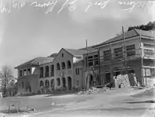 The main elevation is symmetrical about a centrally projecting gabled entry porch which was the core of the 1931 building. The 1939 alterations and additions are in the non-identical wings flanking the central bay and the terminating pavilions to the east and west. The building conveys the impression of a Spanish-Mission or Mediterranean character established in the 1931 design but the overall impact is of thoughtful classicism within a restrained use of Spanish references.[2]