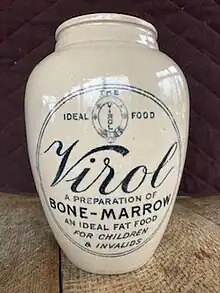 Virol was first made in 1899 as an experimental product by Bovril in their London factory in Old Street, and was designed as a nutritional supplement for the feeding of infants. A company was set up to manufacture it the following year. Demand grew, and by the 1920s, production was transferred to a larger, more modern factory in Perivale. Before World War II the version "Virol and Milk" was established as a direct competitor to Horlicks. During the war, production ceased as the ingredients became too difficult or costly to acquire. After the war, production resumed and the brand changed hands several times with consolidation in the food processing industry, to Cavenham Foods in 1971, Janks Brothers in 1977, and Optrex in 1979. It was discontinued in the 1980s.[2][3]