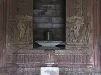 The Vishvanatha site was designed as a panchayatana complex, which comprises one main shrine surrounded by four smaller subsidiary shrines. However, only two of the smaller shrines now survive.[15] The main shrine is oriented towards the east.[14] Nandi Temple, the shrine to its east is dedicated to Shiva's mount Nandi, whose 2.2 m high statue faces the main shrine.[16][17] The shrine in the south-west is dedicated to Shiva's consort Parvati. The Parvati temple is partially damaged, with only its sanctum (garbhagriha) and roof (shikhara) surviving. The sanctum houses an idol of Parvati standing on an iguana.[15]