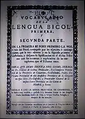Lisboa, a Franciscan friar, resided in the Philippines from 1586 until 1618. He served in Ambos Camarines, where Bicol was widely spoken, from sometime between 1592 and 1602 until 1616. Lisboa died in Mexico in 1628.[1] The Vocabulario was first published posthumously in 1754. A second edition of the Vocabulario was published in 1865 under the expressed order of Bishop Francisco Gainza. It contained 10,495 (Bikol-Español) word entries in 417 pages using 22-inch (560 mm) x 33-inch (840 mm) paper and 5,588 entries in the (Español-Bicol) section in 103 pages. Realubit describes the Bicol vocabulary as "broad in social scale and localization", but criticizes Lisboa's presentation of grammatical tense, affixes, and parts of speech.[2]