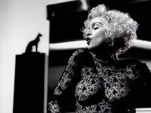 The song opens with Madonna asking, "What are you looking at" as "a way to establish the visual nature of the song lyrics".[23] The escapist lyrics[25][26] of "Vogue" allude to how important a "silly dance-floor ritual can be to its practitioners".[22] On Encyclopedia Madonnica, author Matthew Rettenmund stated that the lyrics "baptize the dance floor as a place where no boundaries exist"; he described a dance floor as a place where "rebirth is possible, where a new life based on gesticulation can replace motionless and emotionless reality and anyone can become if only for the duration of a song – or of one's stamina – a 'superstar'";[27] it is further evidenced by the lyrics "It makes no difference if you're black or white, if you're a boy or a girl".[28] Peter Robinson of Pitchfork viewed Madonna's belief in the dance floor as a "sacred space", as she sings: "When all else fails and you long to be something better than you are today, I know a place where you can get away – it's called a dance floor."[29] According to NME's Nick Levine, the phrase became "essentially a mantra for her entire career".[30] In the middle eight, Madonna performs a rap name-dropping several actors from the Golden Age of Hollywood, stressing her affection for movie stars:[27][31]