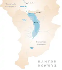 The old village of Innerthal was flooded in 1924 when the dam Schräh was constructed. A new village was built on the current lake.