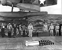 USS Helena survivors after their ship was sunk on July 6, 1943 hold a funeral service for Irwin Edwards aboard USS Honolulu. Edwards died of his wounds after being rescued. Admiral Walden Ainsworth, cap off center, provided comments.