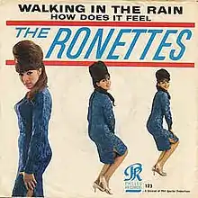 The Ronettes were the first to release "Walking in the Rain". Their single reached number 23 on the Billboard Hot 100 chart in 1964.[2] The song also reached number three on the R&B Singles Chart in 1965.[3] The single contains sound effects of thunder and lightning, which earned audio engineer Larry Levine a Grammy nomination. Phil Spector produced the record.[4]