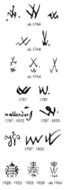 Until 1833 the company remained in the hands of Hammann’s family. The turbulent years after that were characterised by often changing ownership. Among famous namesindications of porcelain tradition and quality even todaycan be found Hutschenreuther, Kämpfe, Sonntag, Heubach, Fraureuth, and Schaubach. The changes in ownership and the economic up and downs were reflected in changes intrademarks. In this time imitations of the Meissen porcelain trademark were noticed and were the subject of complaints to the Electoral Saxe-Coburg Land Authority. Today’s trademark of the letter W below a crown and the foundation year of 1764 was introduced 200 years after the foundation of Wallendorf porcelain.