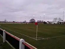 Walsall Wood's home ground, Oak Park. Visible at the extreme left is a memorial to the area's mining heritage, which stands behind the stadium.