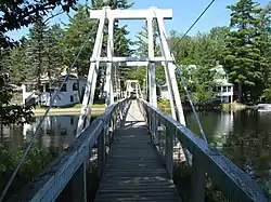 A suspension footbridge built over the Oswegatchie River before 1903 connected the hamlet and the mills for company workers and was one of the longest suspension foot bridges in the United States. The footbridge had been listed on the National Register of Historic Places prior to being destroyed by an ice jam on January 14, 2014. Community efforts began immediately to rebuild the bridge with over $130,000 raised as of May 2016. Several grants and donations by local Foundations were used with the donated money for a matching grant from the New York State Office of Parks, Recreation and Historic Places. Reconstruction of the bridge was completed in November 2016. The Wanakena Presbyterian Church is also listed on the National Register of Historic Places.