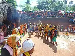 Wanshuwa (Tiwa: Wanshúwa) is an important religious festival of the Tiwa living in Amkha and Marjong villages in Karbi Anglong district.[1] It is celebrated once in five or six years. Generally, this festival takes place between June and August. The ceremony usually starts on a Tuesday and ends on a Thursday.[2] The main function takes place on a Wednesday at the residence of Shangdoloi, the head of the village bachelor's dormitory where the "sham" (wooden mortars) are located. These mortars are partly buried underground and arranged in a circular pattern. While dancing to the rhythm of the khram, pangsi and thurang (musical instruments) members of the Shamadi pound the wet rice with a "lomphor" (wooden pestle) till rice is ground to a powder. After the dance, the grounded rice flour is mixed lightly with water and is used to sprinkle on people present at the ceremony. The remaining flour is distributed among the villagers to prepare wanrusa, a type of steamed rice cake. The next morning they bring the wanrusa to the Shangdoloi’s house and offer it to the deities Sodonga Raja and Maldewa Raja. By the late evening of Thursday, the Wanshuwa festival (Wanshúwa Kham) comes to an end. The Tiwa of the Amkha and Marjong group considers the Wankuri or the flour pounded on the day of the Wanshuwa festival to be sacred rice.[3]
