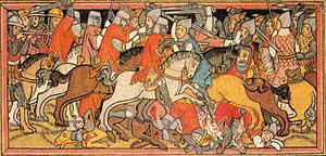 Hanover, too, had in the meantime decided to pay homage in a similar way; after obtaining a legal opinion, they swore an oath of homage. The town received extensive privileges and the right to slight the ducal castle in Lauenrode. In addition to Lüneburg and Hanover, the lords of Mandelsloh, in particular, placed themselves on the side of the Wittenberg dukes. The small towns and villages, as well as the majority of the Lüneburg nobility, remained, on the other hand, loyal to Magnus.[4] In October, Magnus succeeded in gathering an army of 700 knights and squires in Celle. On St. Ursula's Night, the night of 20/21 October, he attempted to capture Lüneburg. After the ducal troops had succeeded in climbing the walls of the town, there were struggles in the streets between the townsfolk of Lüneburg and the Duke's men. The battle was interrupted several times for negotiations, but continued until the surrender of the ducal troops. In the battle, a total of 54 ducal fighters and 27 members of the town were killed, including several mayors and master salters, had fallen. Some of the captured knights were charged with being robber-barons, but the majority were released for ransom.[5]