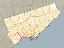 It is bounded on the west by the Humber River, and on the east by rail lines used for Metrolinx operations, Dufferin Street and Lake Shore Boulevard. The ward's north boundary follows the Canadian Pacific Railway track just south of St. Clair Avenue, and the south boundary is Lake Ontario.[3]