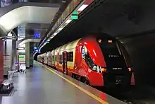 A rail link was built at a cost of 230 million złoty to connect the airport's Warsaw Chopin Airport railway station (built as part of the former Terminal 2) to the Warsaw city center.[60] The station was opened on 1 June 2012, with service starting on the same day.[61] Trains run every 15 minutes. Service to the station is provided by both Szybka Kolej Miejska and Masovian Railways.