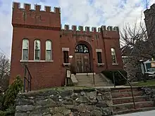 This building was built in 1912 on the site of a former armory, built in 1854, that had been destroyed by fire. The old building was in the Greek Revival style, like Apponaug's other early civic buildings. Designed by prolific Rhode Island architects William R. Walker & Son, the new building was designed in what was at the time called "a castellated style".[2] The building was occupied for armory purposes until 1977, when the last member of the Kentish Guard died. At that time the building was deeded to the city, which rented the building to the Warwick Museum, now the Warwick Museum of Art, which has remained there ever since.[3]