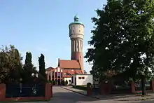 Another tower, built in 1907 and now unused, is located at the Września railway station, near several apartment buildings and an overpass. Another, smaller tower was destroyed during the bombing on 5 October 1939.