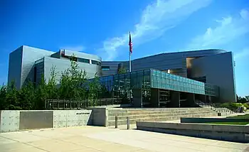 The exterior features a large set of stairs that leads from the street level to the main entrance on the second floor.[9] This 240-foot (73 m) wide grand entrance also serves a security function of reducing the chance of a car bomb reaching the main entrance.[9][15] Other security measures in the design include the underground parking and setting the courtrooms back from the street.[9] The facility was designed as a Security Level IV facility by the government.[9] Other exterior features include structural elements left exposed along with portions of the curved metal skin that extend out from the building.[4] Mayne, the building's architect, stated that it was "the language of the ribbon" to describe the exterior design.[4]