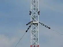 As opposed to other guyed masts used for medium wave transmission, its guys are not partitioned with insulators. Instead they are grounded over coils situated directly close to the anchor block, which are so tuned, that high frequency currents in the guys are as low as possible.