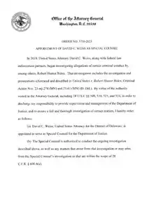 - ↑ Carney, Jordain (July 10, 2023). "U.S. Attorney David Weiss says he has not requested special counsel status as part of the years-long investigation into Hunter Biden". Politico.