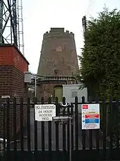 The windmill at the top of the village is believed to have been constructed in 1730.[3] It was described as "a powerful corn mill consisting of four pairs of mill stones and one flour machine" when advertised for sale in 1804.[4] It stopped grinding corn by the end of the century, though would instead be used to grind coal to make briquettes.[4] By 1905 it was used only to serve as a stand for a small turbine, which generated electricity for the public house next door.[4] During World War II the local home guard based their headquarters there.[3] It now houses communication equipment after being bought by the Midlands Electricity Board in 1952, and is now owned by E.ON.[3][4] It remains the last remaining windmill in the Staffordshire Moorlands after Dilhorne's windmill disappeared by the year 1900.[4]