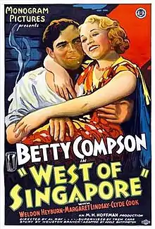 West of Singapore is a 1933 American pre-Code drama film directed by Albert Ray and starring Betty Compson, Weldon Heyburn and Margaret Lindsay.[1]