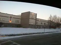 Western's first location was in a three-story house on Hull's Main Street, known as "The Mansion."[7][8] The school building was built in 1924 for $64,000.[7][31] The first expansion of the 1924 building was completed in 1948, and included a library and science laboratories. In 1957, a gymnasium, locker rooms, a stage, and two classrooms were added for $125,000.[7] In 1964, a space for music was built for $75,000.[7] By 1968, an addition to the science wing was finished for $175,000.[7] A new gymnasium was constructed in 1980 for $900,000.[7] Renovations to the whole building took place from May 1994 to September 1995 for $2 million.[7] A maintenance project in 2006 added a strength and conditioning room, as well as a bus barn to the school, for $1 million.[7] In June 2014, Western Christian received grants from the Minnesota Twins Major League Baseball team and the Modern Woodmen of America for renovations to their baseball and softball fields.[32] New classrooms were added to the building in 2015.[33] The next year, air conditioning was installed and the student commons remolded.[34]