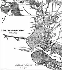 Two months later, the rail connection to the San Francisco and Oakland Railroad was finally in place, as was the expansion of CPRR's Oakland Pier.[13] On the morning of November 8, 1869, the first transcontinental train to use the expanded ferry terminal at Oakland Pier traversed the SF&O and the Western Pacific Railroad to reach Sacramento, and continue eastward on the Central Pacific Railroad. The city of Oakland held a large celebration later in the day to greet the first westbound transcontinental train.[34]