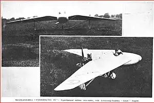- Three-seat cabin monoplane of 44 ft 4 in (13.51 m) span and 19 ft 6 in (5.94 m) length, produced in 1931. Pitch and roll control by elevons. Also a braced monoplane, the wings had variable sweep through a small range of angles, to allow longitudinal trim in flight in the absence of any horizontal stabiliser. Air Ministry Specification 16/29 was issued to Westlands for an "Experimental Tailless Aircraft" with a contract to design and build one aircraft.[6] The aircraft was given serial K1947 and first flew in March 1931 with a 120hp de Havilland Gipsy III engine in a pusher configuration.[6]