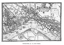 The development of the area began with the establishment of Westminster Abbey on a site then called Thorney Island. The site may have been chosen because of the natural ford which is thought to have carried Watling Street over the Thames in the vicinity.[4] The wider district became known as Westminster in reference to the church.