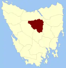 County of Westmoreland, bounded on the north by the river Meander, and by the great road to the Surrey Hills from Deloraine bridge to the ford in the river Mersey; on the east bv a portion of the river South Esk and the Lake river; on the south by a line from Wood's lake to the Shannon at St. Patrick's plains, and by that river to the Great lake and thence by a line to the river Nive; on the west by the river Nive to its source, and thence by a line by the extreme Western bluff to the ford in the Mersey.
