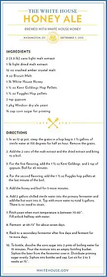 White House Honey Ale is the first beer known to have been brewed in the White House.[1] The process began in January 2011[2] at the request of President Barack Obama, who purchased the homebrewing kit using personal funds.[3] As of 2012, three styles have been brewed in addition to the honey ale: White House Honey Blonde Ale, White House Honey Porter and White House Honey Brown.[4]