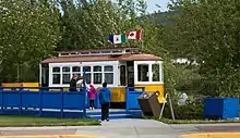 The White Pass and Yukon Route narrow-gauge railway linking Skagway to Whitehorse had begun construction in May 1898. By May 1899, construction had arrived at the south end of Bennett Lake.[17] Construction began again at the north end of Bennett lake to Whitehorse. It was only in June–July 1900 that construction finished the difficult Bennett Lake section itself, completing the entire route.[18]